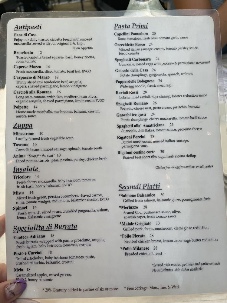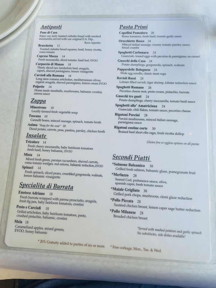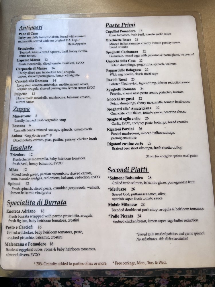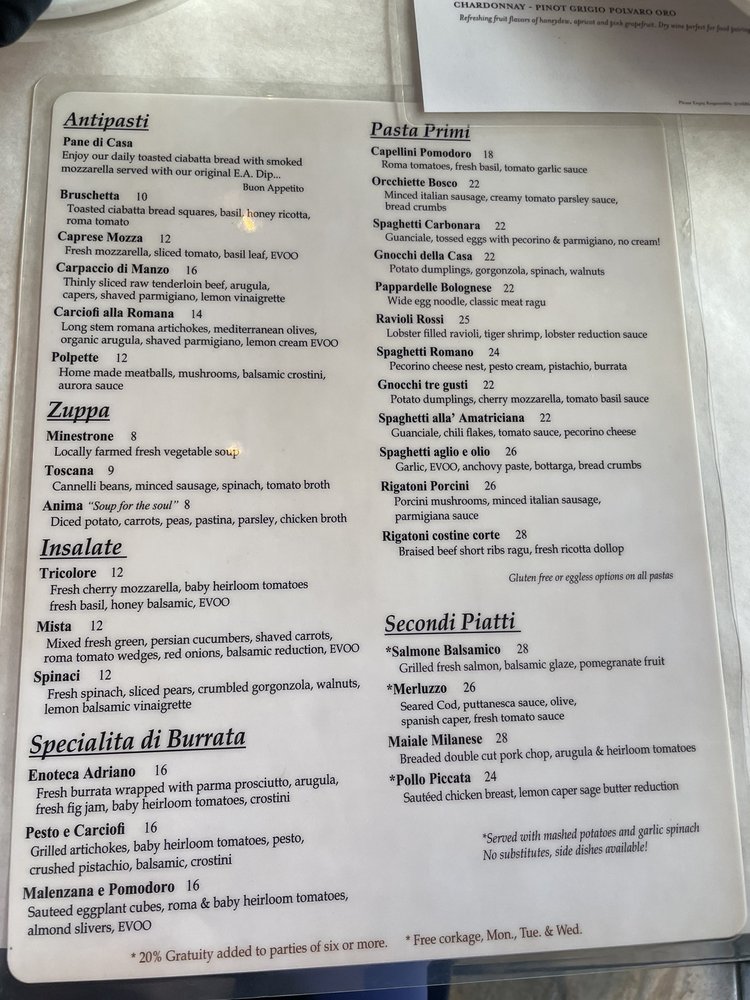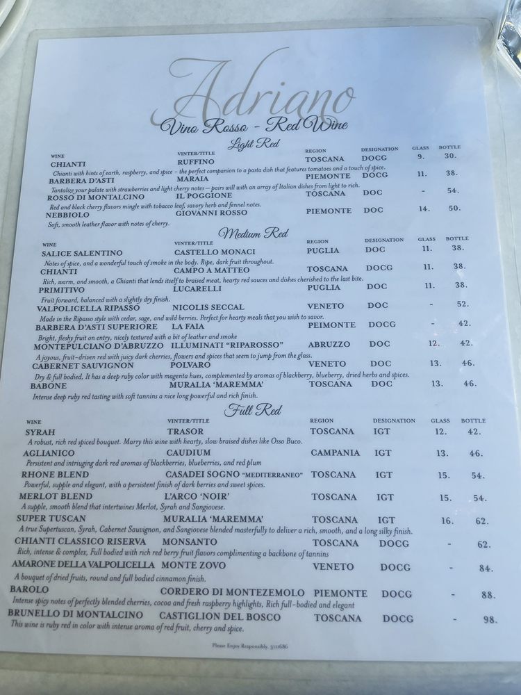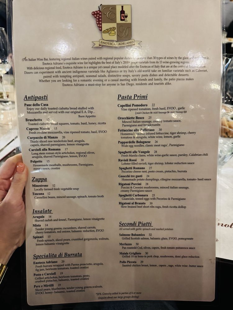Welcome to Enoteca Adriano, a charming Italian wine bar located in the heart of San Diego. This cozy spot combines an intimate ambiance with a carefully curated menu that emphasizes authentic Italian flavors. As you peruse their offerings, prepare for culinary delights such as crispy arancini, refreshing artichoke salad, and various sumptuous paninis packed with savory meats and cheeses.